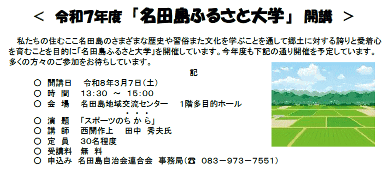 予定のふるさと大学は講師に車椅子マラソンの田中秀夫氏をお迎えします。