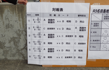 R3.12.12(日)名田島小学校グラウンドにて、名田島地区サッカー大会が開催されました。新型コロナウイルス感染症の関係でここ2年間、多くの行事を中止せざるを得ませんでしたが、久しぶりの大会でした。感染予防対策も充分行う中での開催でした。全ての試合前には、全員必ず消毒をして臨みました。