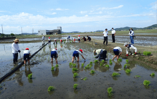 R4.6.23(木)名田島小5年生が田植え体験をしました。男女4名ずつの8名のうち、女の子4名は田植え体験があり、男の子4名は全く未体験でした。初めのうちは慣れない手つきで植えていましたが、だんだん要領よく植える事が出来るようになりました。たくさんのお米が出来るといいですね。秋の収穫が楽しみですね。