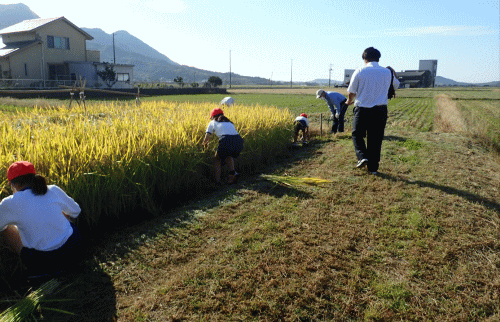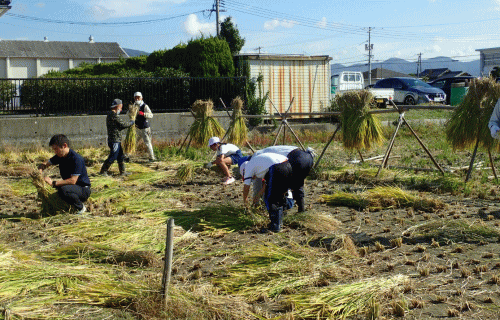 R4.10.21(金)に名田島小学校5年生による毎年恒例の稲刈り体験がありました。地域のボランティアや自治会連合会生涯学習部会の5人がお手伝いをしました。初めのうちは、鎌を使うこともあまりなれていないので大変でしたが、段々うまく扱うようになり、早くなってきました。ハゼ掛け作業も体験しました。お疲れ様でした。今回は、名田島小学校の卒業生が、フィールドワークで学校におられ、先輩としてお手本を見せておられました。