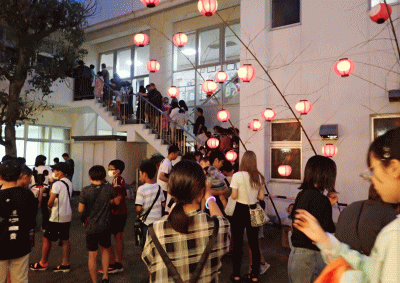 ただ今2023年7月22日(土)19時20分です。辺りが暗くならないので延び延びになっていた、ロウソクで点灯する提灯の点灯が、ようやく終わりました。会場は、昨年に勝る来場者数で、ごった返しています。お化け屋敷の入場待ちの列も、どんどん過密になっています。