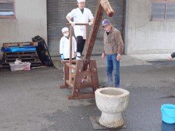| 2025年12月14日 六神社大麻祭(しめ縄づくり) 複数人、チームワークが必要な作業です。藁をすいて、ケバ立ちを取り除いておきます。 しめ縄の太さの藁をロープで縛って吊るし、3等分にして各自、左手の親指方向に回転してひねり、声をかけながら、そのまま左の人に藁を渡します。 長さを出すため、途中で藁を継ぎ足し、これを繰り返し出来た分ずつ引き上げてつくります。できたしめ縄はケバ立ちをカットしきれいに整えます。 紙垂と前垂れをつけて、神社に取り付けていきます。