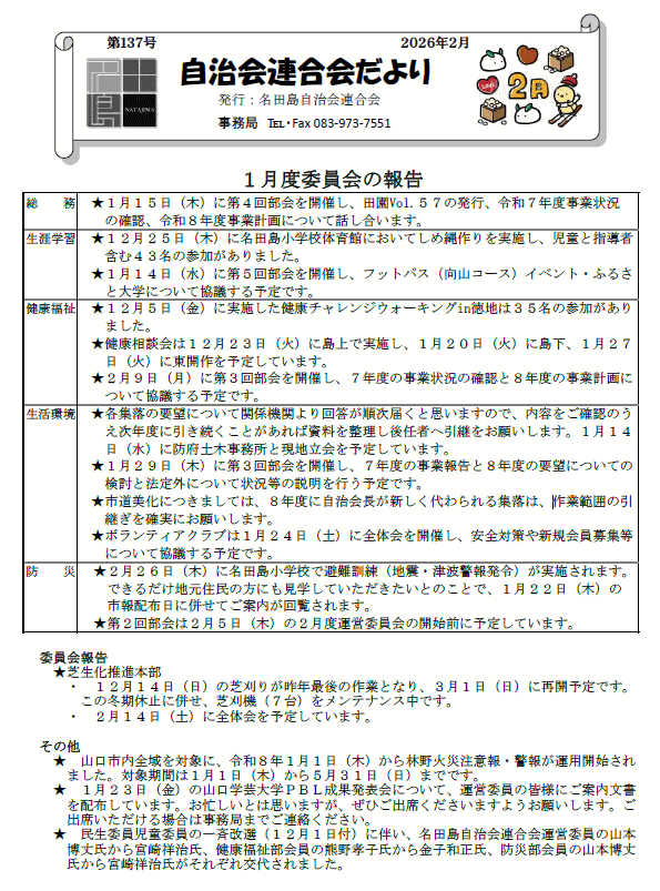 | 2026/01/23 地域交流センターだより 2/1号 自治会連合会だより 137号 2026/01/18 田園だより Vol.56 令和7年12月 2026/01/12 “どんど焼き”で無病息災願う 2026/01/11 「山口市消防出初式」開催 2025/12/16 六神社のしめ縄づくり 2025/12/13 自治会連合会だより 135号 2025/12/12 地域交流センターだより 11/15号 地域交流センターだより 12/1号 地域交流センターだより 12/15号 2025/11/30 名田島ふるさとまつり 2025/10/26 自治会連合会だより 134号 地域交流センターだより 11/1号 2025/09/29 自治会連合会だより 133号 2025/09/28 地域交流センターだより 10/1号 2025/09/05 自治会連合会だより 132号 2025/09/05 地域交流センターだより 9/1号 地域交流センターだより 9/15号 | |||||||||||||||||||||||||||||||||||||||||||